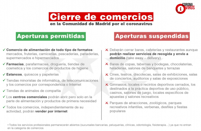 スペインで感染拡大している武漢新型コロナウイルスの封じ込め対策として、マドリード州で商業施設閉鎖が始まった。 マドリード州政府からできること、できない事のリストが発行されたので記載しておく。 今のところこの閉鎖期間は15日間で、延長する可能性もある。
