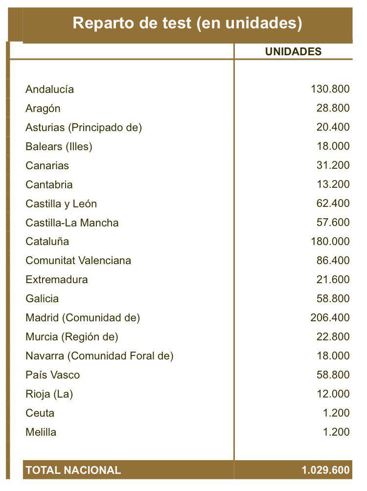 スペイン中央政府は日曜日と月曜日の二日にかけて各自治州政府に感度64%の簡易検査キット合計1,029,600個を配布する。