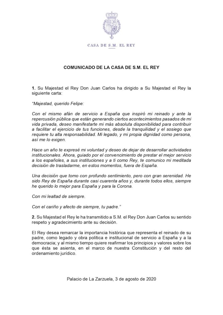王室の発表によると今回の元国王の決定に関し、「元国王は1年前から公的な活動を行わない意向を示しており、今回元国王の過去におけるプライベートな事柄に対する出来事への社会の影響を鑑みて、スペイン国外へ住居を移すと決定した。」とのこと。 また、「フェリペVI世現国王の公務を妨げないため。」ということも発表されている。