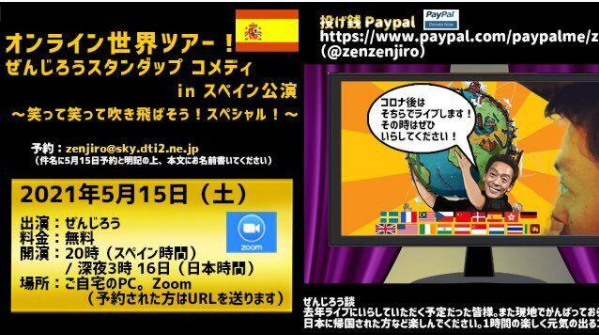 『無料!オンライン世界ツアー! ぜんじろうスタンダップ コメディ(日本語) in スペイン公演 ~ コロナ後はそちらに向かいます! 笑って笑って吹き飛ばそう !スペシャル〜』