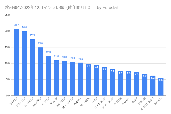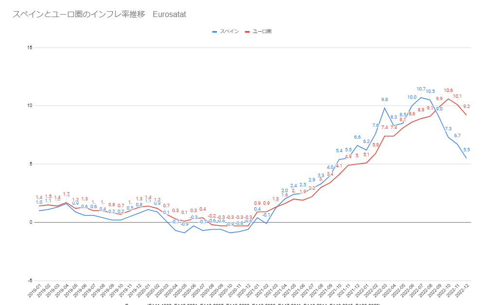 欧州委員会統計局EUROSTATによると18日、2022年12月のユーロ圏の2021年同月比のインフレ率が発表され、平均で9.2%となり11月の10.1%から若干減少したことが分かった。 また、欧州連合内では、10.4%から11.1%と増加した。 一方、スペインは5.5%で欧州連合では最も低いインフレ率だった。