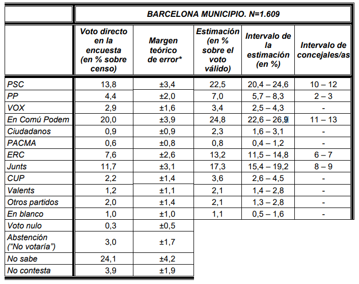 5月11日に発表されたCISが実施した世論調査によると、今月5月28日に実施される統一地方選挙で、BComúが全体の24.8%の得票率を獲得し、第一党となり、現職アダ・コラウ市長が再選する可能性があることが分かった。 第二党はカタルーニャ社会党(PSC)の22.5%。