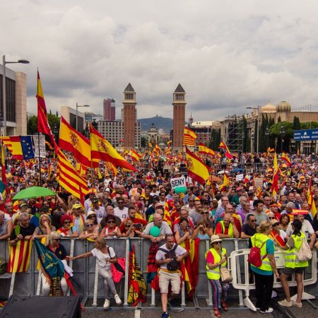 カタルーニャ州独立反対派市民らがバルセロナ市カタルーニャ広場に集結